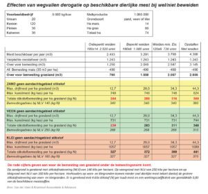 Na het wegvallen van derogatie moet dit bedrijf jaarlijks 1.243 kuub drijfmest afvoeren. In de berekening is voor dit bedrijf het effect van niet beweiden en drie beweidingstrategieën op de totale stikstofbemesting van grasland meegenomen. Er wordt uitgegaan van 35 kuub drijfmest op maisland. ‘In alle scenario’s blijkt de melkveehouder op zand niet te voldoen aan de bemestingsnorm van grasland. Er is te weinig mest voor de graslandbemesting. Hoe meer uren weiden, hoe groter het tekort. Ook als de veehouder compenseert met kunstmest’, zegt Hoekstra.