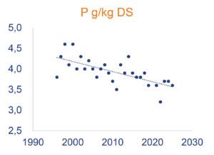 Het moge bekend zijn: de daling komt voort uit de beperking van gebruik van drijfmest. Dat bevat veel meer mineralen en sporenelementen dan een stikstofkunstmest. Een breed spectrum aan sporenelementen en mineralen in kuil daalt daarom door het aangescherpte mestbeleid, waaronder naast fosfor ook kali en mangaan.