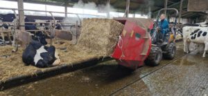 De ondernemers lopen tweemaal daags de ligboxen langs en vullen de boxen ’s middags bij met een verse laag stro. Er gaat een pak stro per dag doorheen. Het instrooien is zo gepiept en kost hooguit 20 minuten per dag. De Bijma’s gebruiken daarvoor een minishovel met een strostrooier. Ze rijden over de dichte vloer en gaan pal langs de boxen. De melkveehouders willen op termijn een automatische strostrooier installeren aan een rail in de stal.