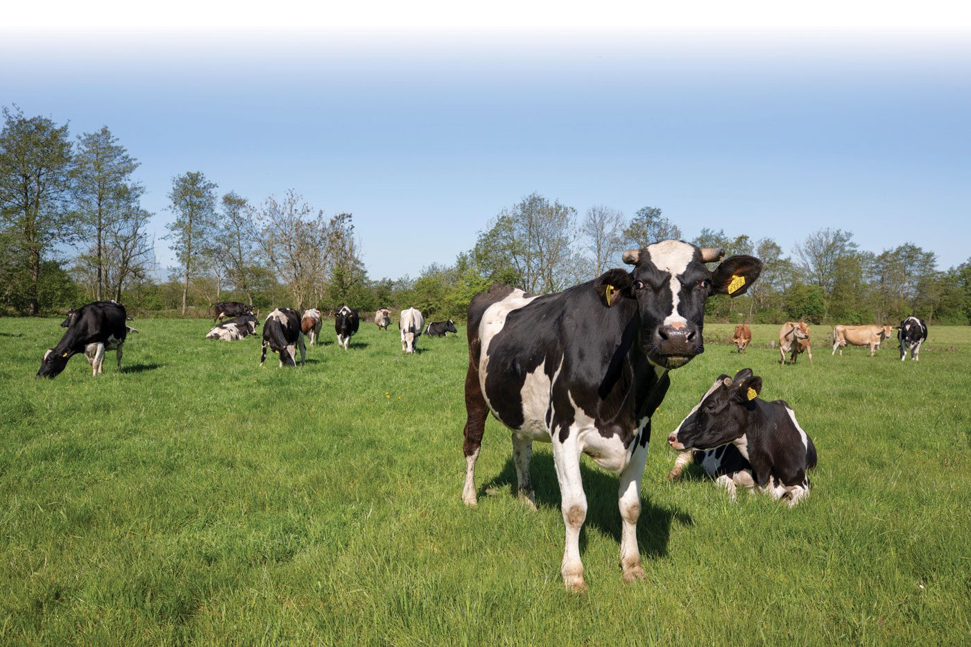 De 120-koppige veestapel van Pieter de Jong in Surhuisterveen bestaat uit verschillende kleuren en rassen. De roodbonte dieren met duidelijk meer vlees op de botten zijn z’n favoriet, maar er lopen ook tien zuivere Deense Jerseys tussen en inmiddels wordt er onder andere gekruist met Brown Swiss. Al de dieren hebben gemeen dat ze hun melk produceren op een overheersend grasrantsoen. ‘Van het voorjaar tot het najaar weid ik de koeien zoveel mogelijk’, vertelt de biologische melkveehouder.