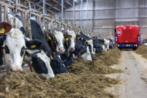 Zonder weidegang kan Hulder jaarrond een constant rantsoen voeren. De melkkoeien krijgen een basisrantsoen dat bestaat uit graskuil, perspulp, maismeel, raap, tarwegist Sastapro en een buffer van Provimi. Er zijn twee krachtvoerstations, waaruit alleen hoogproductieve koeien een zetmeelrijke brok met 15% ruw eiwit kunnen vreten. ‘Gemiddeld voeren we 4,5 kilo brok per koe per dag, verdeeld over robots en voerstations. Het krachtvoer is van Deuka, een Duitse producent. Hulder heeft de brok al voor een jaar in voorkoop gekocht, omdat de prijs nu relatief laag is. ‘Zo houden we de totale voerkosten met € 16,64 per 100 kilo melk laag. Ook zorgen we voor een goede benutting van het voer door het zeven van mest en door te letten op het ureumgehalte in de melk.’